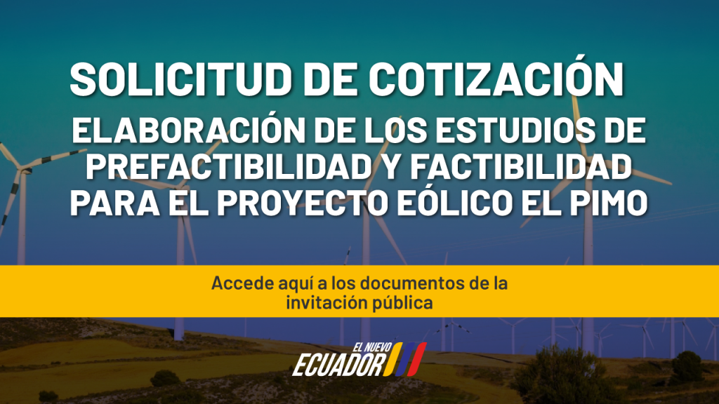 La Empresa Pública Estratégica Corporación Eléctrica del Ecuador – CELEC EP, tiene el agrado de invitarles a enviar sus muestras de interés (cotización), para el proceso de selección denominado: “SUR ELABORACIÓN DE LOS ESTUDIOS DE PREFACTIBILIDAD Y FACTIBILIDAD PARA EL PROYECTO EÓLICO EL PIMO”.