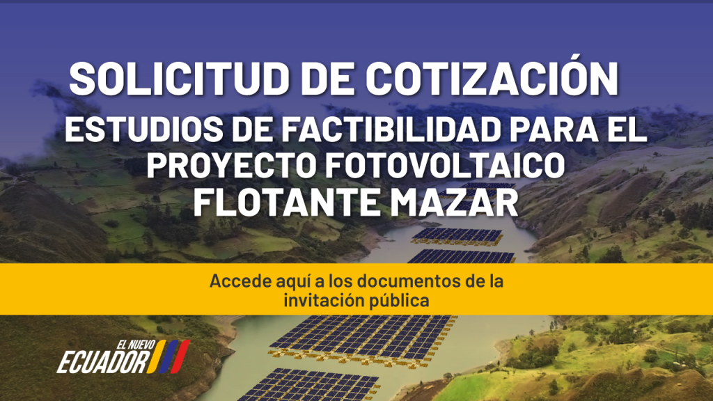 La Empresa Pública Estratégica Corporación Eléctrica del Ecuador – CELEC EP, tiene el agrado de invitarles a enviar sus muestras de interés (cotización), para el proceso de selección denominado: “SUR ESTUDIOS DE FACTIBILIDAD PARA EL PROYECTO FOTOVOLTAICO FLOTANTE MAZAR”.