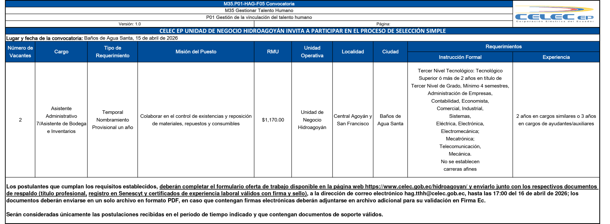 FORMULARIO OFERTA DE TRABAJO ESPECIALISTA INGENIERIA DE LA PRODUCCIÓN MECÁNICO GENERACIÓN HIDRÁULICA