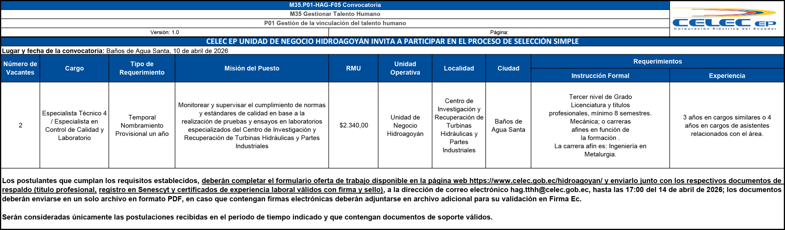 PROCESO DE SELECCIÓN SIMPLE – Especialista en Control de Calidad y Laboratorio